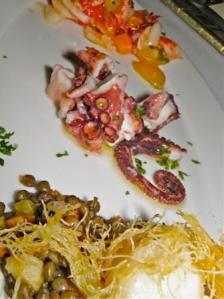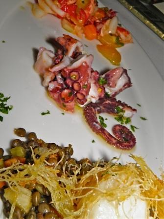 Krug Grand Cuvee. But not just any Jero, this one was signed by Olivier Krug. It was still quite taut very good for getting the hunger going but will still improve, youthful but very Krug. This was served with a selection of Mixed Crudo, all delicious. We then had the first of two Italian whites an oaked but balanced and good 2009 Miani Banel Sauvignon Blanc, it had good dose of freshness but also a waxy element. The second white was, richer but not with the desired freshness, a 2008 Jermann IGT Were Dreams. Interesting but no more than that. The two whites were served with Lobster with cherry tomato salad Crispy scallops with lentils and delicious Octopus.