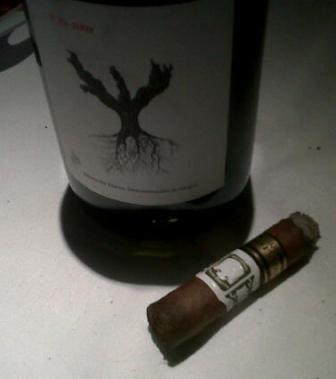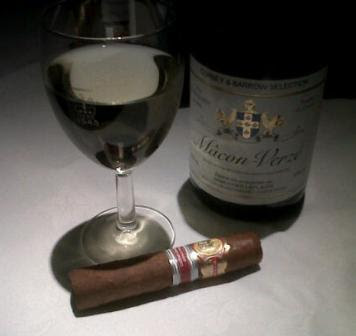 What resulted was the most smoky and decadent room in London, a top Monday night! We had two combinations – El Rey del Mundo ‘Choix de l’Epoque’ a UK Regional Edition for 2009 with Macon Verze 2009, Domaines Leflaive. The cigar is essentially a short Robusto (50 ring gauge by 4 and a bit inches), a straw and hay like aroma and a just under medium body, it worked well with the Macon Verze which has great fruit but also a good texture. The 2009 is drinking really well know, a dash of opulence with acidity to keep it in check. I had never had the L’Epoque before and was impressed.