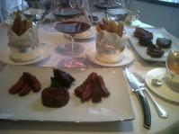 Now on to the wines. To kick off we had Henriot 1988 Champagne, not a house I am that experienced with. Some 1988’s are quite atypical as there is a roundness and oxidative opulence about several efforts from 1988. I thought this was a very good one, with a backbone of Chardonnay it had some richness but there was poise and freshness in equal measure, a great start. Up next with possibly the finest Steak Tartare I have ever had, it is easy to talk about balance in wines well this had balance in food, we had Grands Echezeaux 1991, Domaine de la Romanee Conti this was at a simply brilliant stage in it’s evolution and perfect now. It had pure fruit but that wonderful “I’m developing” feel about it too. The various facets of the wine just all worked together, we got through it quickly it was just so delicious. Confirms what a lot of people say about the 1991’s being both brilliant as a vintage and great from now onwards, a rare treat and certainly the best Grands Echezeaux I have had. After the Tartare we went to a dish that was visually stunning but also a marvel, Lobster and marinated Rib “kebabs”, this was about the only chance we were going to get to have the one contribution I made on the wine front Bourgogne Blanc 2005, De Vogue (all the other wines were down to generosity of my host), now on the face of it having a Bourgogne Blanc seems hideously out of place amongst the other wines but de Vogues’ one is actually Musigny Blanc Grand Cru it is just that they declassify it to Bourgogne Blanc as they have replanted it in the mid 90’s, the 1993 was the last vintage under the Musigny name. The wine was showing well, tropical, expressive and high-toned it worked well though in truth was not at the wonderful maturity of the others.Up next was the main course I mentioned above. With it we had two wines – Barbaresco 1978 Gaja & Petrus 1990 from magnum – both worked wonderfully with the beef. The Gaja was still of full colour and had, as expected, a slight Bovril note on the nose with good fruit under it, the wine really opened up in glass and the acidic, tannic bite (a good thing) it initially showed did mellow. Now onto the big boy – Petrus 1990 – it was a beauty. The colour was still full, a tiny bit of evolution, very bright colour. As you would expect it had a beautifully rounded expressive Pomerol nose and palate, there was that tell-tale Petrus depth too. There was very gentle development over the course of the magnum, it had such balance and grace that it was almost possible to forget it was Petrus. I just enjoyed it for being a great wine. Clearly it has a way to go but it is not too early to be drinking it all, great length, a very rare treat.