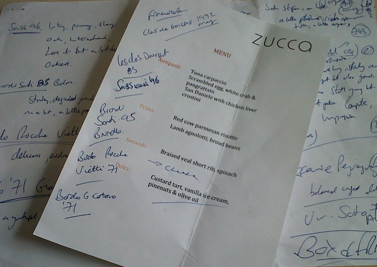 On Wednesday this week I was delighted to join eight other wine merchants/traders/friends and Sam Harris, restaurateur and fellow Piedmont fan in the private room at Sam’s Zucca Restaurant in Bernmondsey Street. I can’t take any credit for organising this at all. Although comments from others that I “live” in Zucca are only a slight exaggeration. The theme was initially set as Barolo but it was loosened up a bit which was a good thing.