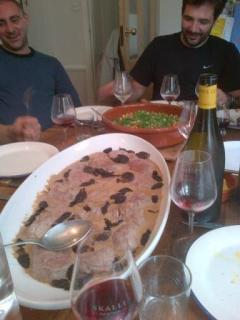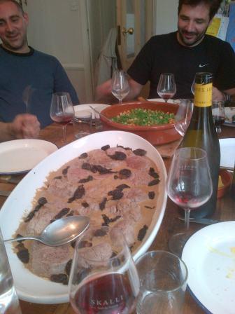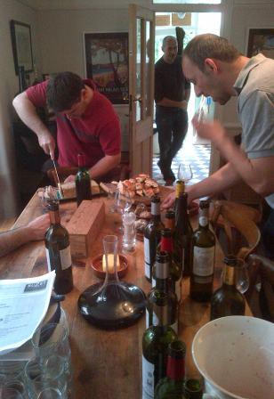 Yesterday I was lucky enough to be asked by a friend, Mr T, who happens to be in the wine trade but also have a child at the school my wife is head of (bit convoluted I know) to a lunch he was throwing for his French Brotherhood. So it was me and eight french chaps. This was doubly good as they all love food and wine but also they spoke almost exclusively in French…something I need to improve and fast. We all met in rainy north London at 12.30 and first up was a tasting of 8 red Buzet and 2 white Buzet. The reason for this tasting was that Mr T had some samples of the wines to look at as a possible listing for him. We didn’t come to any massive conclusion, there were some nice wines without being really earthy or simply typically “Buzet” enough.Prince d’Albret 2004 –Simple, rustic, soft (I did explain the the name was potentially problematic!!) – 13