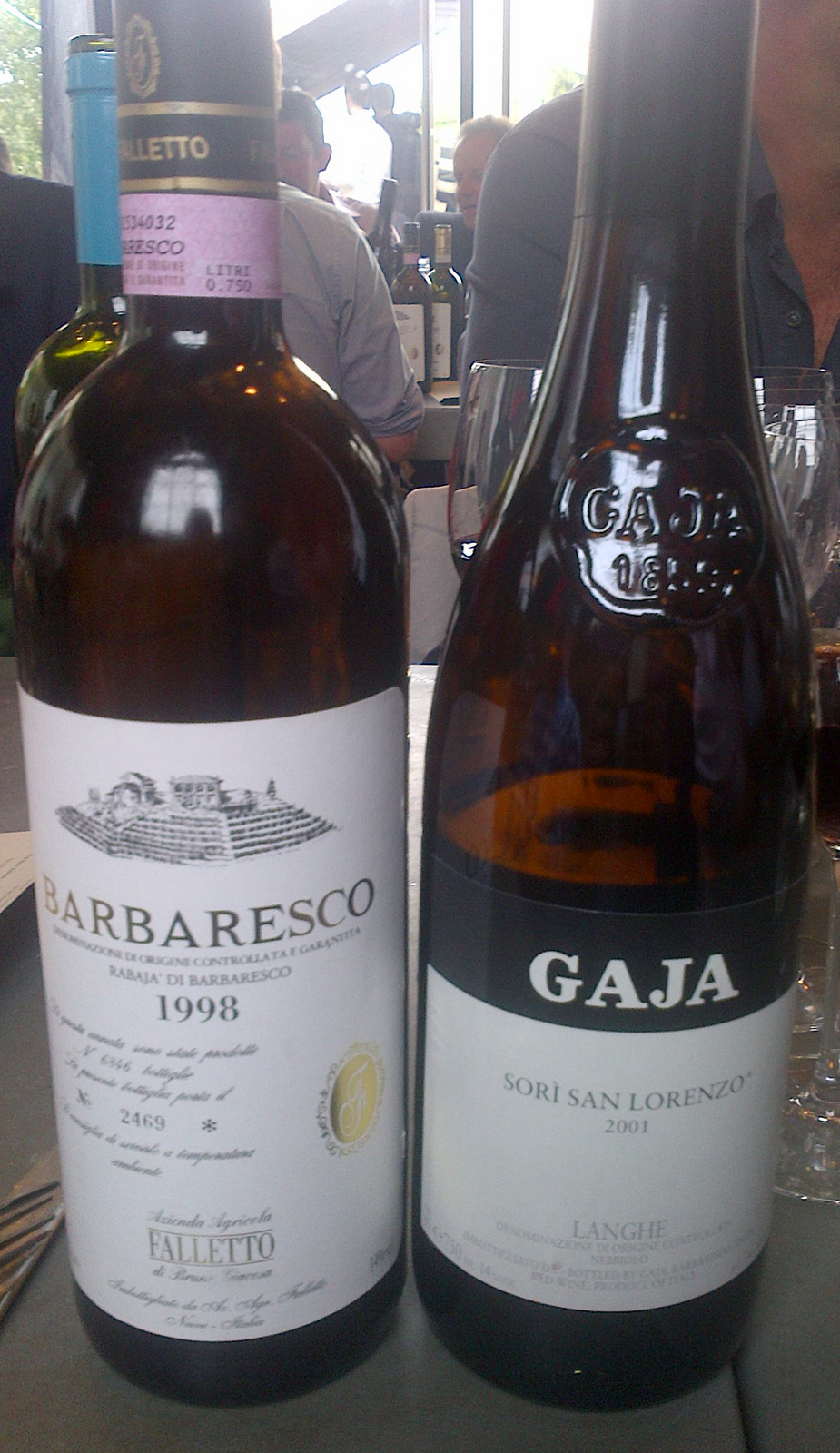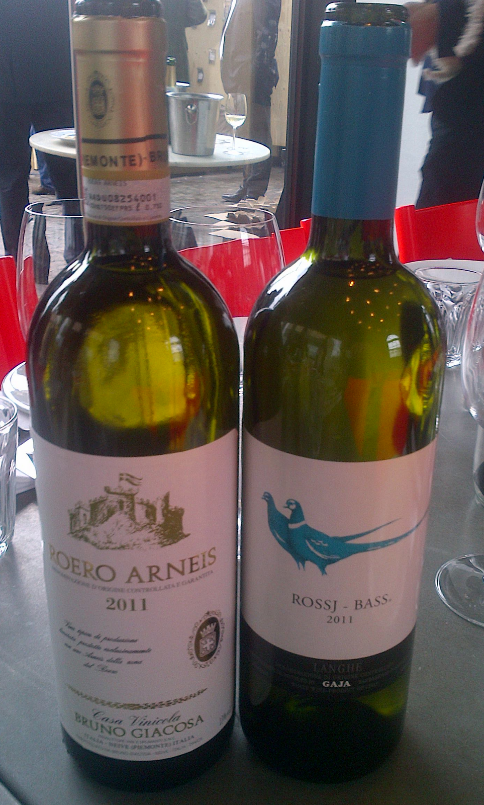 Roero Arneis 2011, Bruno Giacosa & Rossj-Bass Chardonnay 2011, Gaja. I really enjoyed both, Arneis is sometimes a bit tricky I find but this had enough lush fruit to go with the tartness that the grape gives, good food wine and about as good as Arneis gets. The Rossj-Bass was very good indeed, the fact it sees used oak and is therefore subtle as well as ripe works really well. The dash of Sauvignon that is added probably helps to lift the aromas too, an impressive lunchtime white that I’d like to drink again.