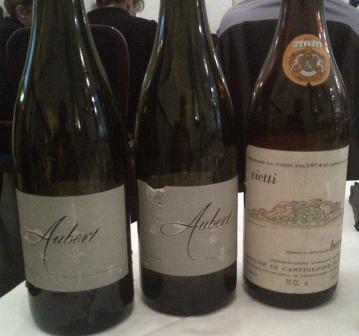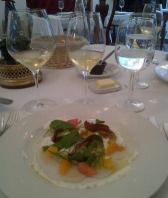 It was to be a meal of two whites and one red. The Whites were both Chardonnays from Mark Aubert in Sonoma Coast. Both whites were from 2010, The Aubert “Ritchie” Vineyard and the Aubert “Lauren Estate” Vineyard. The fact we had Ritchie on the right and Lauren on the left was a sensible decision as the labels are strikingly sameish. Having consulted the notes on the wines it appears both wines are as the names suggest from different locations. Both see largely the same winemaking – harvested at night for freshness, from different blocks (5 for Ritchie & 6 for Lauren), Barrel fermented and then given 11 months in new French oak before 3 months in tank with no fining or filtration before bottling. The later fact was clear as the wines were slighty hazy, something I quite like. So what did they taste like? There were encouraging similarities and differences. Both had quite high alcohol (15.2% I think) but neither showed it. They had a lime an lemon sherbet type fruit but were wines of texture. The differences were in shape as much as anything. The Ritchie was a rounder more lush example, the fruit being almost over-ripe but not quite. The Lauren is a more Burgundian Meursaultesque expression, more savoury, less opulent, all in all a shade classier to my palate. Both good and many of these comments only apply as we tasted both together. A really interesting pair that continued to evolve, certainly of high quality.