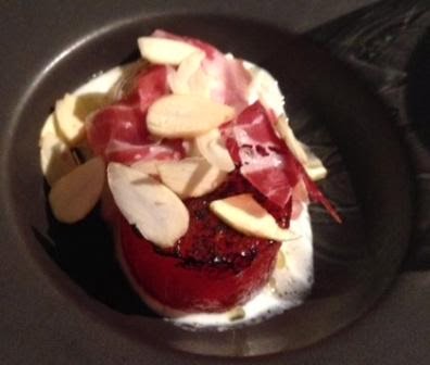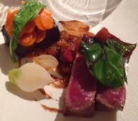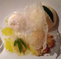 We moved onto the true “red wine food” now with a lovely dish of Wild Mallard, Williams pear, cavolo nero, chestnuts and cider. The next wine did a good job of fooling us all. It was Cote Rotie La Mouline 2004, Guigal and the main reason it fooled me was that I always think of oak with these wines but this was a gorgeous expression of fruit, red and black with a dash of spice but a lovely medium weight. No attempt at all to wrestle with you just charming balance and this after nothing more than a very brief decant. Really wonderfully handled wine from an under-rated Rhone vintage. I didn’t even bother picking a dish of the day but if I had this next one would have been a contender – Devon Ruby red Sirloin and cheek with turnips and croutons. The flavour and quality of the fat was exquisite. The last pair of reds were served side by side and after a lot of time was spent (by us not the restaurant!) muddling our glasses up we got things organised. The Ornellaia 2001 impressed with the fruit balancing the savoury elements well, there is no rush at all with this wine but if you have some I would start now as it is in a lovely place. The other red was Ridge Montebello 2003 and it did not disappoint. Just enough extrovert fruit but all in that poised balance that the estate seems to just manage over an over again, medium body at most.