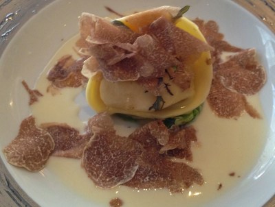 Smoked potato and poached egg ravioli with lightly roasted garlic emulsion and white truffle
