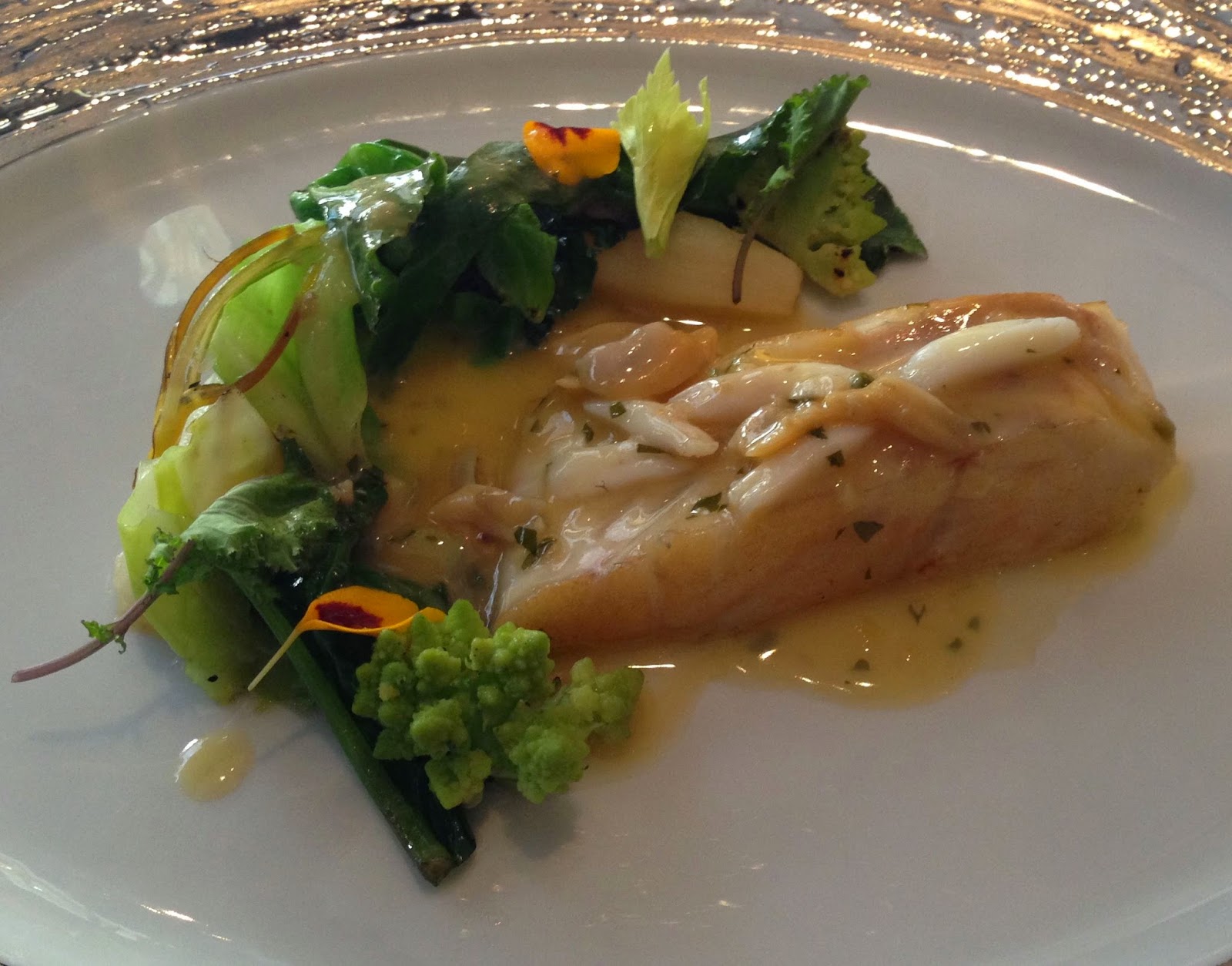 Cornish turbot baked on the bone with seaweed, palourde clams, sea beet, wild chervil and charred spring cabbage