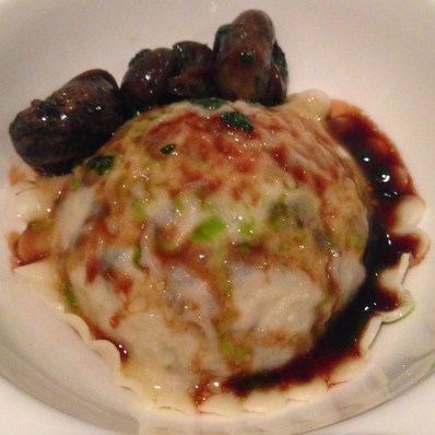 | Ravioli of Wild Mushrooms with Melted Onions, Parsley Oil and Snails |