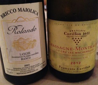 This was a little bit of a drive from the Hotel, 25 mins, but well worth it, once we got into the wines we were in the zone…we got a white from the region, Rolando Langhe Bianco 2013 from Bricco Maiolica, to accompany a white Burgundy that we had taken, Chassagne-Montrachet 1er Cru Les Macherelles 2012 from Francois Carillon.