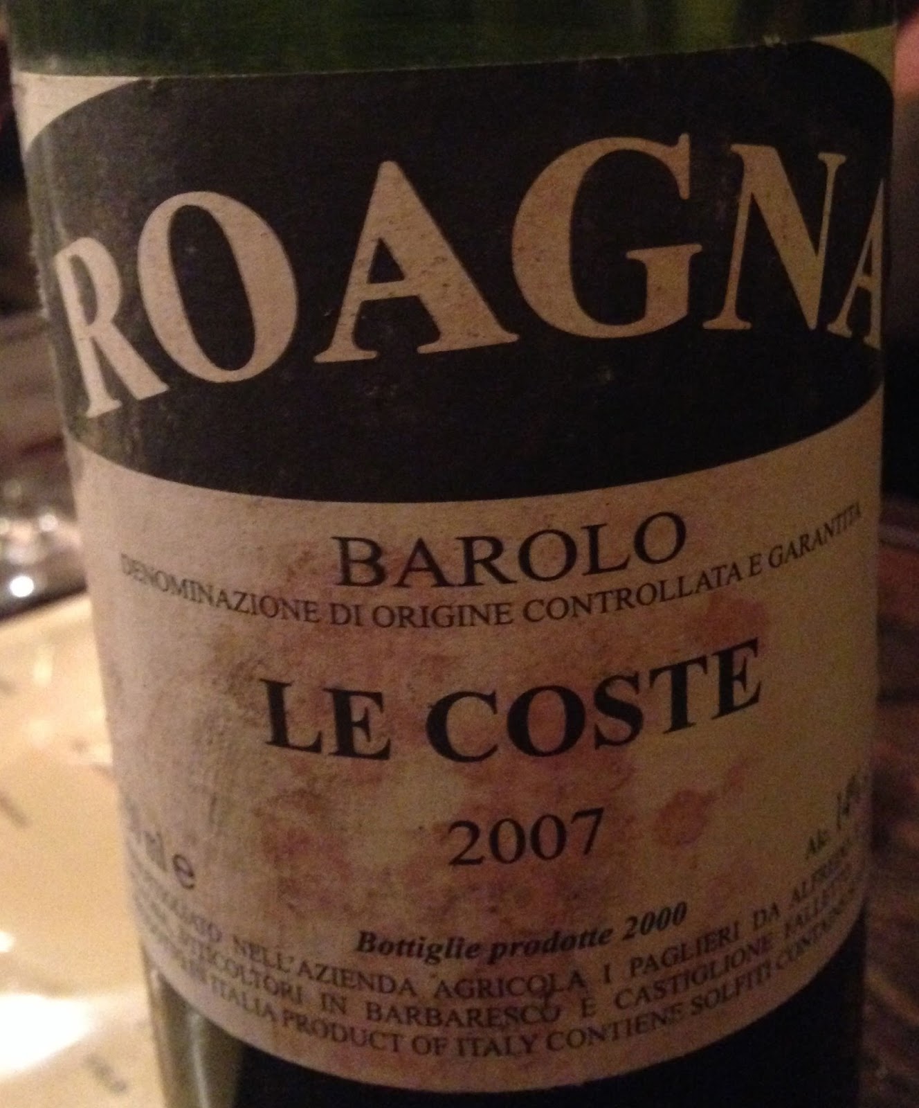 The rest of us were delighted to have been joined by Guilia for dinner so we got ordering – food and wine. A Gaia & Rey 2013 from Gaja was a good start, it is a wine I have often enjoyed, it is more a savoury scenario than a wine of fruit but it works. Dusty then decided we needed Sperss 1996, Gaja from bottle and to have a look at a comparison of bottle and magnum by ordering Barolo Monfortino 2000 from magnum. It was a great decision. The Sperss came out more and more in the glass, a serious wine with years ahead. The Monfortino was as you’d expect a little younger and more dense, than the bottle at Lunch, it was wonderful to have it in a glass for that bit longer and to drink it in more volume. The food was a delight and we all have a great time telling the earlier “trailer plane” story (ask me and I’ll explain). Some grappa appeared from the next door table, it had rather lovely packaging. Fortunately we only sampled a very little bit. Whether the next bit was sensible or not is another matter but, what the hell, our trip was nearly over so back to Saracca for one last bottle and what better to choose than a bottle from one of the producers we had seen – Barolo Le Coste 2007 from Roagna. I loved it, 2007 may not be a classic vintage but when handled with care it can be lovely, this was…Stefano made sure we all got back in one piece…quite a day!