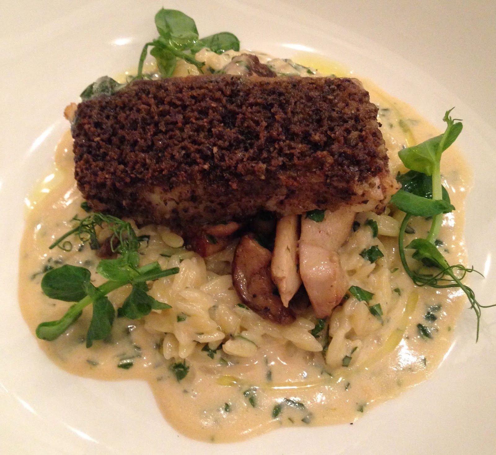 | Pan fried olive crusted stone bass risoni,wild mushrooms and mushroom velouté |
