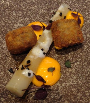 | Croquettes of Mangalitza Pork with Smoked Yolk, Glazed Salsify and Black Pudding |
