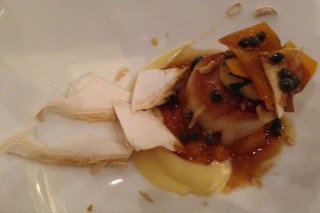 | Seared Isle of Orkney scallops with parsley root, delice pumpkin and hazelnut |
