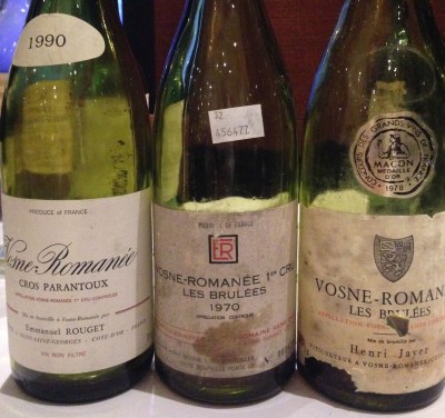 Any frustration evaporated rather rapidly and here are the three reasons. Vosnee Romanee Cros Parantoux 1990 from E.Rouget was superb, ripeness, richness, sturdy. The ripeness had good depth and some grit. With time some leather and spice, this was very much the opulent texture of the lavish 1990’s. Then a little more age, Vosnee Romanee Les Brulées 1977 from H.Jayer, sweet, rounded and charming, so elegant so seductive, complex and absolutely “a point”. Such a treat. The final Musketeer, Vosnee Romanee Les Brulées 1970, R.Engel with oranges, dried herbs, tea, some sweetness, bricky acidity and a slightly citric edge, almost a note of cherry, good now and probably not worth holding longer. What a trio!