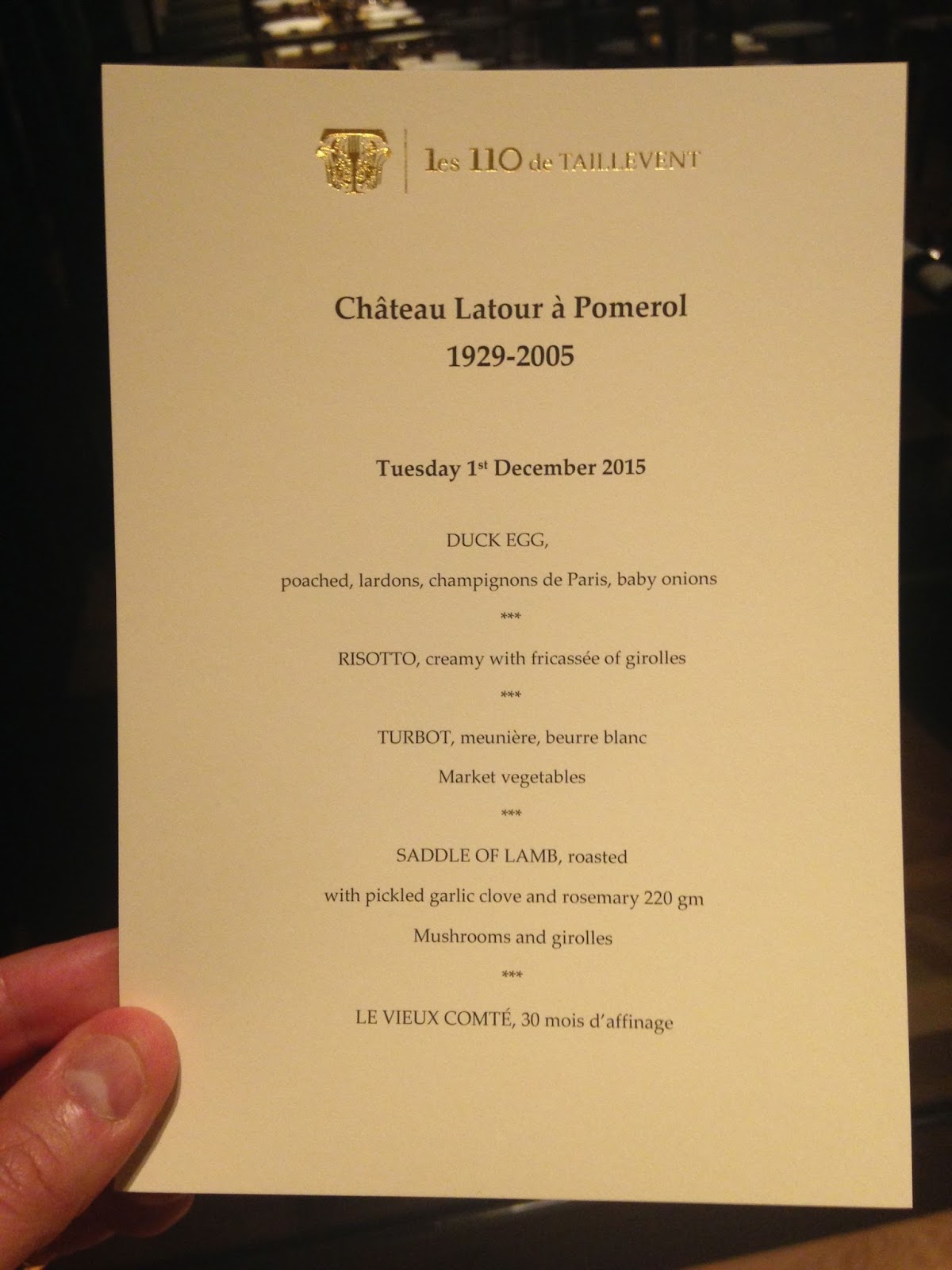 I was especially looking forward to this – a very thorough look at the wines of Latour a Pomerol at Les 110 de Taillevent in London with Edouard Moueix in attendance. I have always had a real soft spot for Latour a Pomerol, now yes there might be a commercial edge to that (I work for the agent) but it is more than that. The estate has made several legendary wines. It is part of a very great collection of right bank estates in the hands of ETS JP Moueix. It still somehow seems to fly slightly under the radar. I think this is for a couple of reasons, it is made as a wine to drink, it tastes well when young but is not showy or uber-extracted. People always tend to think that something must be wrong if the legendary wines of the past have not been replicated, not so. I am always excited to open a bottle, even more so a magnum of course, of Latour a Pomerol.