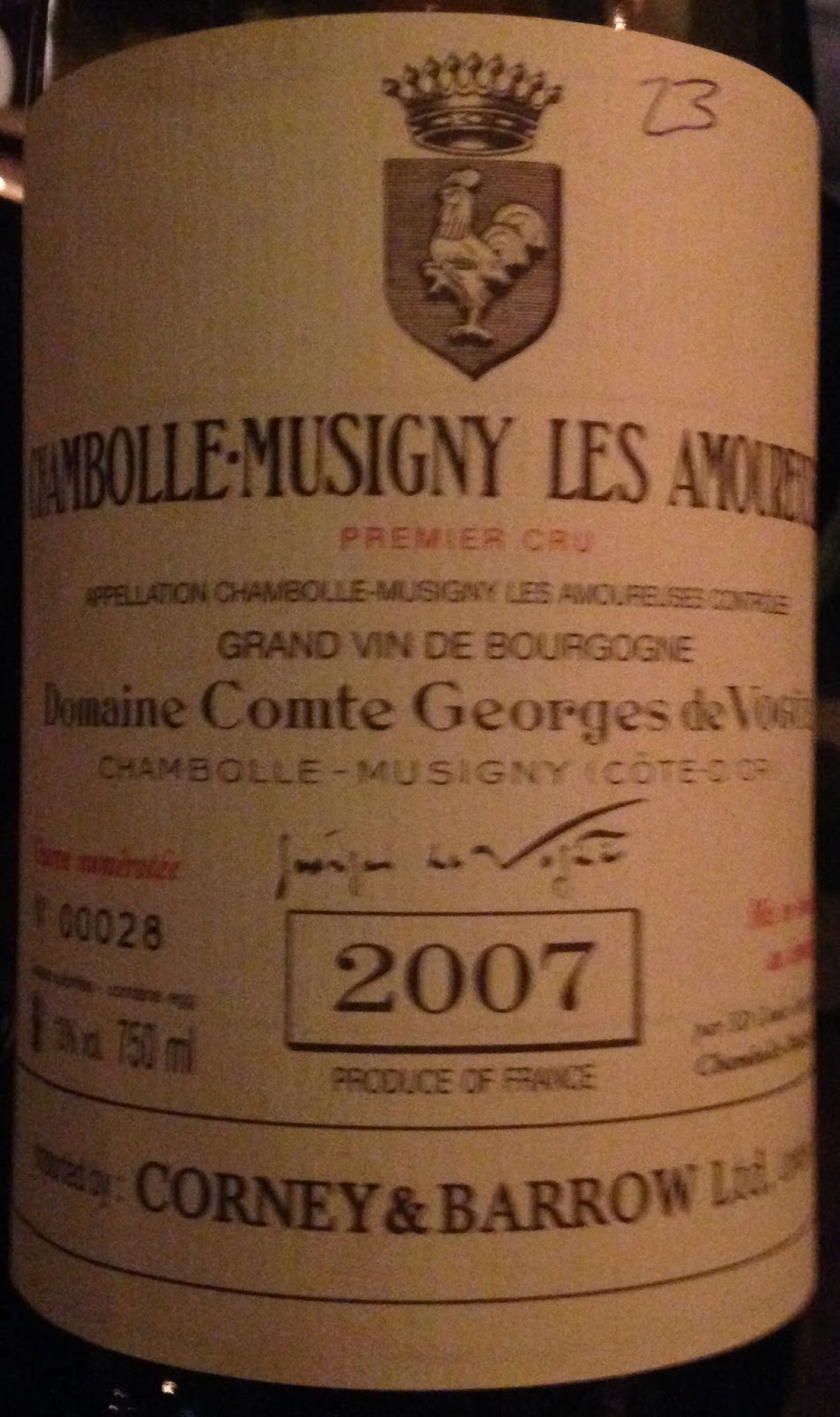 So, onto the reds, Chambolle-Musigny 1er Cru Les Amoureuses 2007 from De Vogue was up first courtesy of Rajiv. We felt it would need the most air so we wanted to get it in the glasses first. I love 2007’s as I have said many times. This though is a more serious interpretation of the vintage. There is quite a lot of body here and a richer texture, the nose is more refined and 07′ like, a little orange peel. It is a wine to be patient with as was shown by coming back to it at the end of the night when it had softened a little.