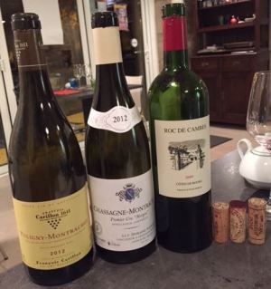 We arrived and about 3 minutes later had supper in Puligny. The three bottles in the picture.