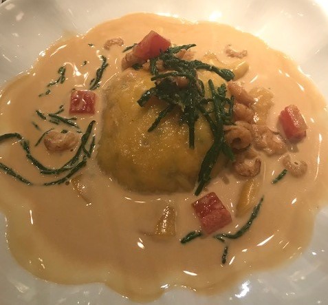 Crab Raviolo with Samphire, brown shrimps, fondue of leeks and bisque sauce