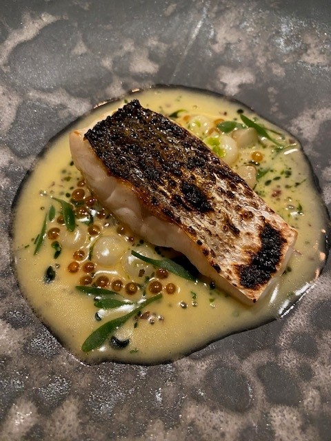 Wild sea bass, Chinese artichoke, trout roe and finger lime